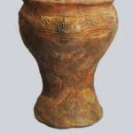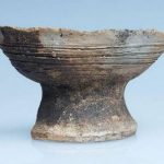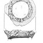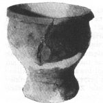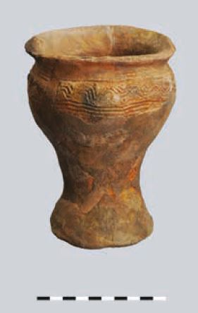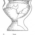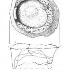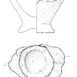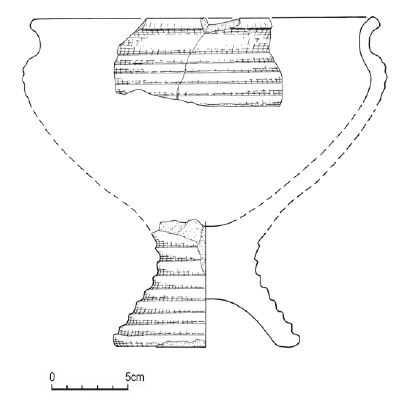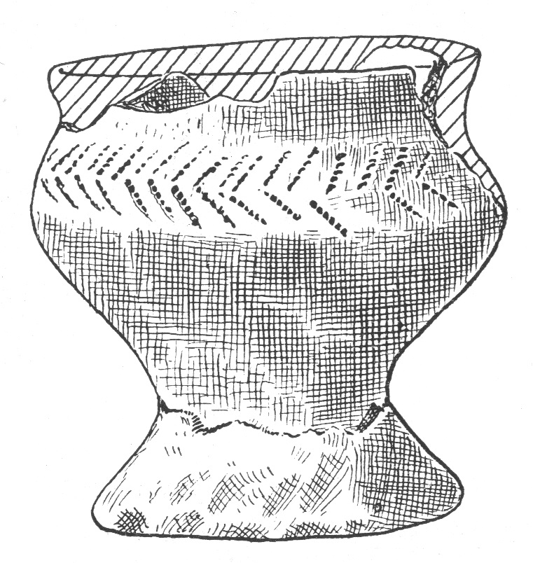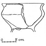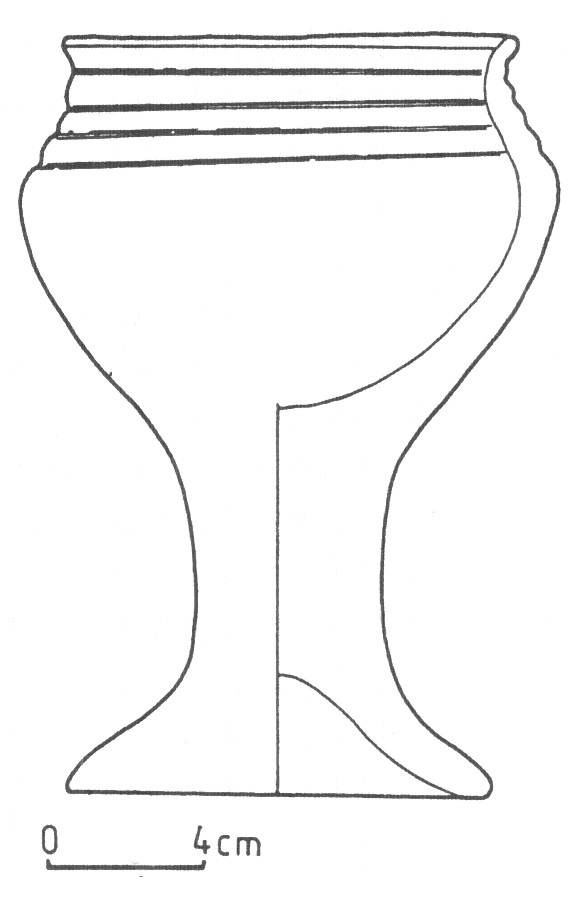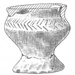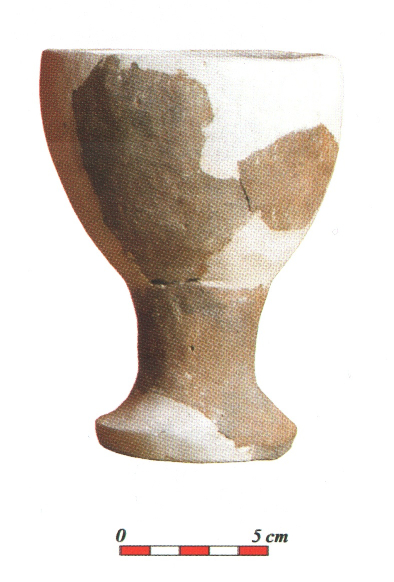 - brak rycin; osada, warstwa I, jama 1; dno na pustej nóżce, wys. 2,5 cm; nóżka większego pucharka (?)