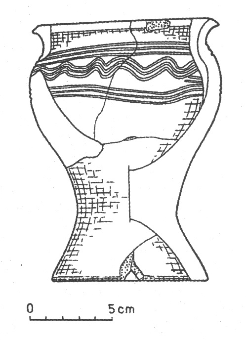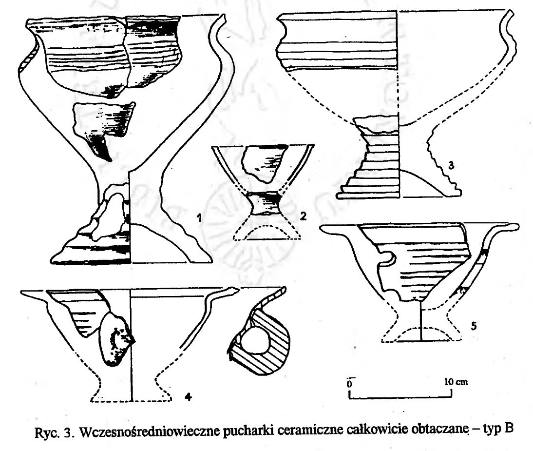 Parczewski 1989, s. 33 – autor przy naczyniach na niskiej pierścieniowatej nóżce, przytacza takie o nieco wyższej, przez innych już klasyfikowane jako puchary na pustej nóżce (Czeladź Wielka) – pominę te zabytki jako, że być może ich dno zostało ukształtowane w ten sposób przy użyciu nakladki na koło garncarskie, pozostawiając jedynie ten (nr 2 poniżej), który przypomina zabytek wymieniony przez Dąbrowskiego pod pozycją 164 w zestawieniu pucharków (nr 1 poniżej):