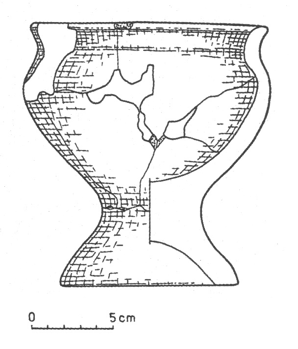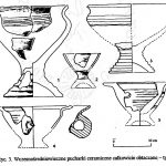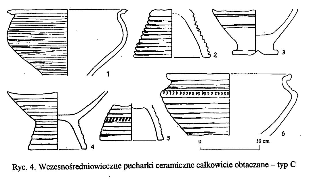 - osada, warstwa orna; puchar wiązany z najstarszą fazą osady: przełom V/VI w – VII w.; silnie schudzona glina drobnym i średnioziarnistym piaskiem; powierzchnie szorstkie, słabo wygładzone z wyjątkiem części przykrawędnych noszących ślady podobne do lekkiego obtaczania