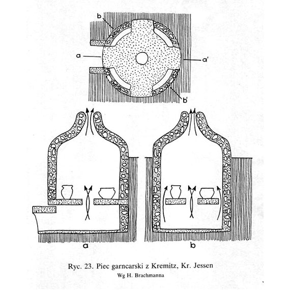 “Wypału dokonywano w piecach zapewne komorowych (ryc. 23), w atmosferze na ogół nierównomiernej – częściowo redukcyjnej, częściowo utleniającej.”1