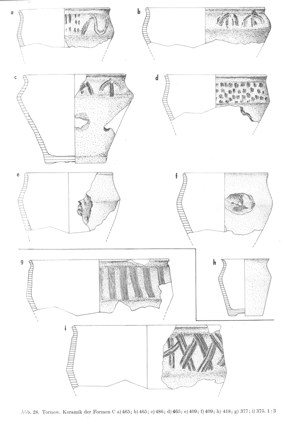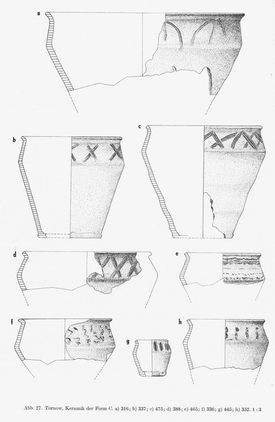 Podobne zdobnictwo zdarza się również na naczyniach reprezentujących typ Tornow (Kobylińska et al. 2020 s. 86), co możemy zaobserwować na wydzielonej kiedyś formie Tornow C (Herrmann 1966). Tornow C od Menkendorf miałaby odróżniać dwustożkowata forma (Dulinicz 1994, przypis 5), ale takie stwierdzenie wydaje się dyskusyjne. Może autorowi chodziło o to, że w typie Menkendorf często mamy do czynienia z załagodzonym załomem brzuśca. Inni wprost stawiają znak równości pomiędzy Tornow C i Menkendorf (Chrzan 2024 s. 170-171).