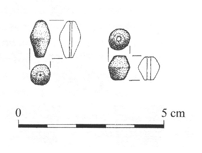 - paciorek dwustożkowaty z czarnego bądź czarno-ciemnogranatowego szkła o nr inw. Obi208/97 (Siemianowska 2011, Materiały, Obiekt 2A);