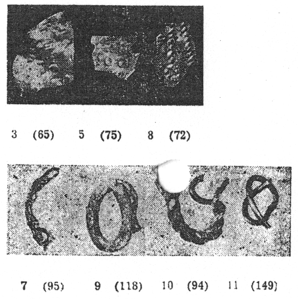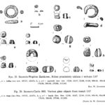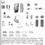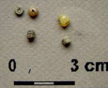 Zaraz, zaraz, “brak odnalezionych gotowych lub nieudanych wyrobów“? Przecież w Wiadomościach Numizmatycznych wyraźnie podano, że w partii przylegającej bezpośrednio do paleniska obiektu nr 2, później opisywanego jako 2D (Rzeźnik 2006 s. 189), znaleziono monety srebrne, fragmenty srebrnych ozdób i część ozdoby brązowej oraz paciorki szklane jak poniżej (Bartczak et. al 1990 s. 11-12, 23):