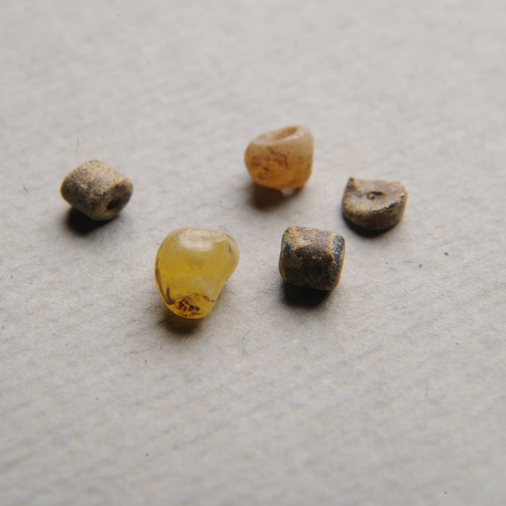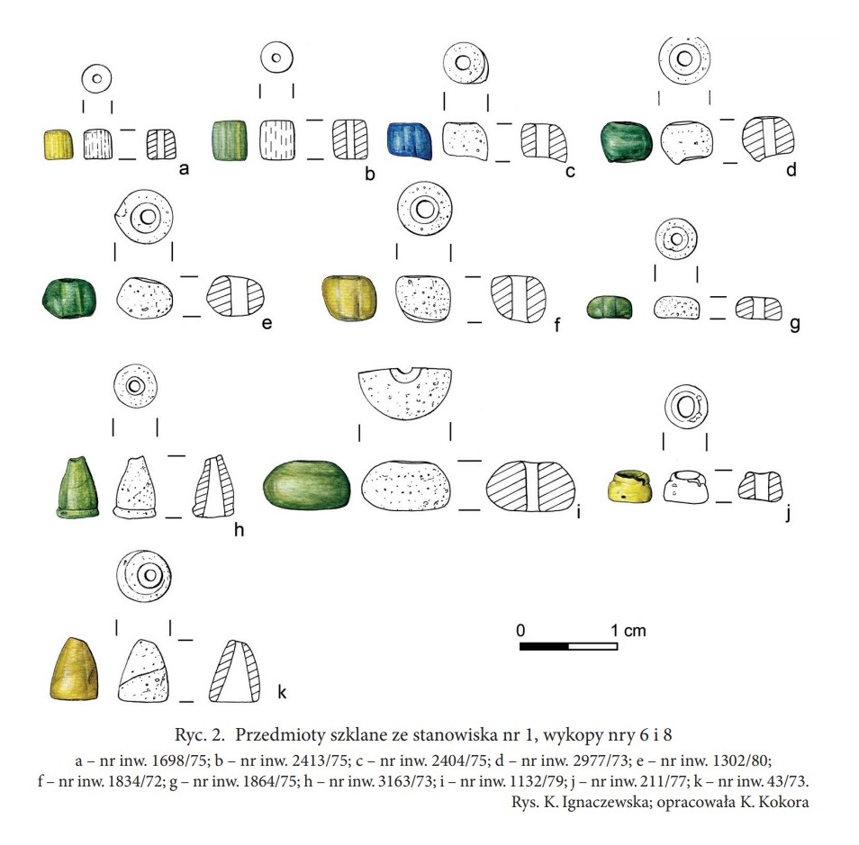 - kilka szklanych paciorków w wykopach V/98 oraz VI/99 (Siemianowska 2011 s. 5);