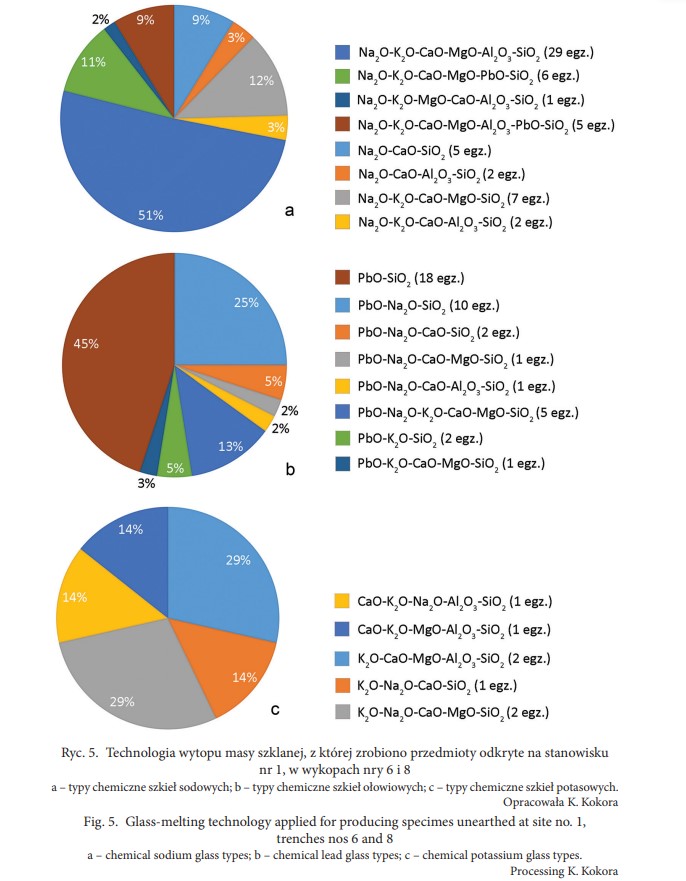 Spośród przebadanych pod względem składu chemicznego wolińskich wyrobów zidentyfikowano 18 sztuk wytworzonych ze szkła ołowiowo-krzemowego, wśród których pojawiły się egzemplarze w wersjach nieprzezroczystej brązowo-żółtej – masa szklana oraz przezroczystej ciemnozielonej i słabo przezroczystej żółtej – guzki zdobiące naczynie (Kokora 2019 Tabela 4, Ryc. 5). Niestety nie znalazłem informacji, czy w tej grupa zawierają się paciorki i czy są nimi którekolwiek z prezentowanych na rycinach.