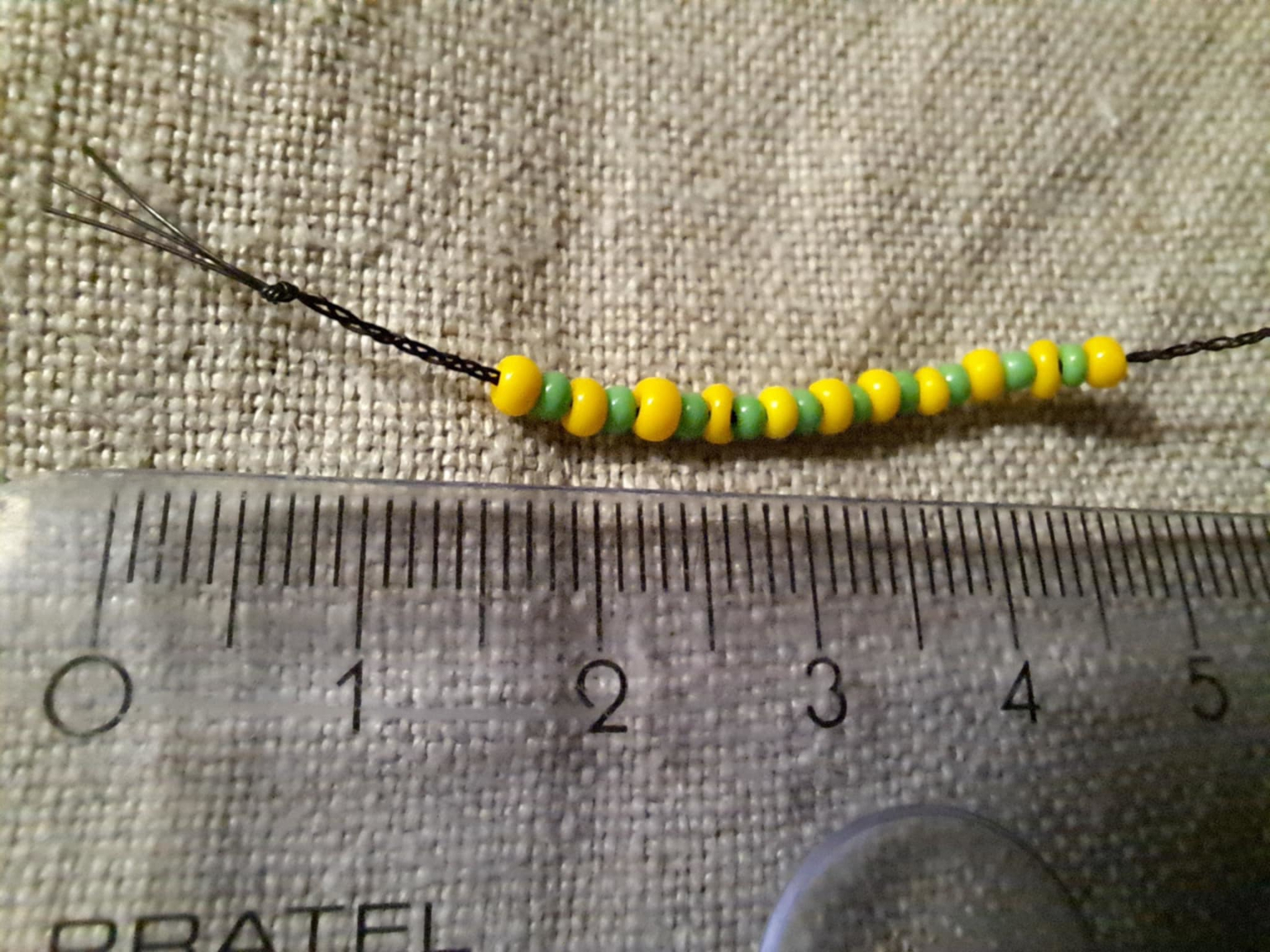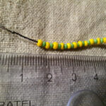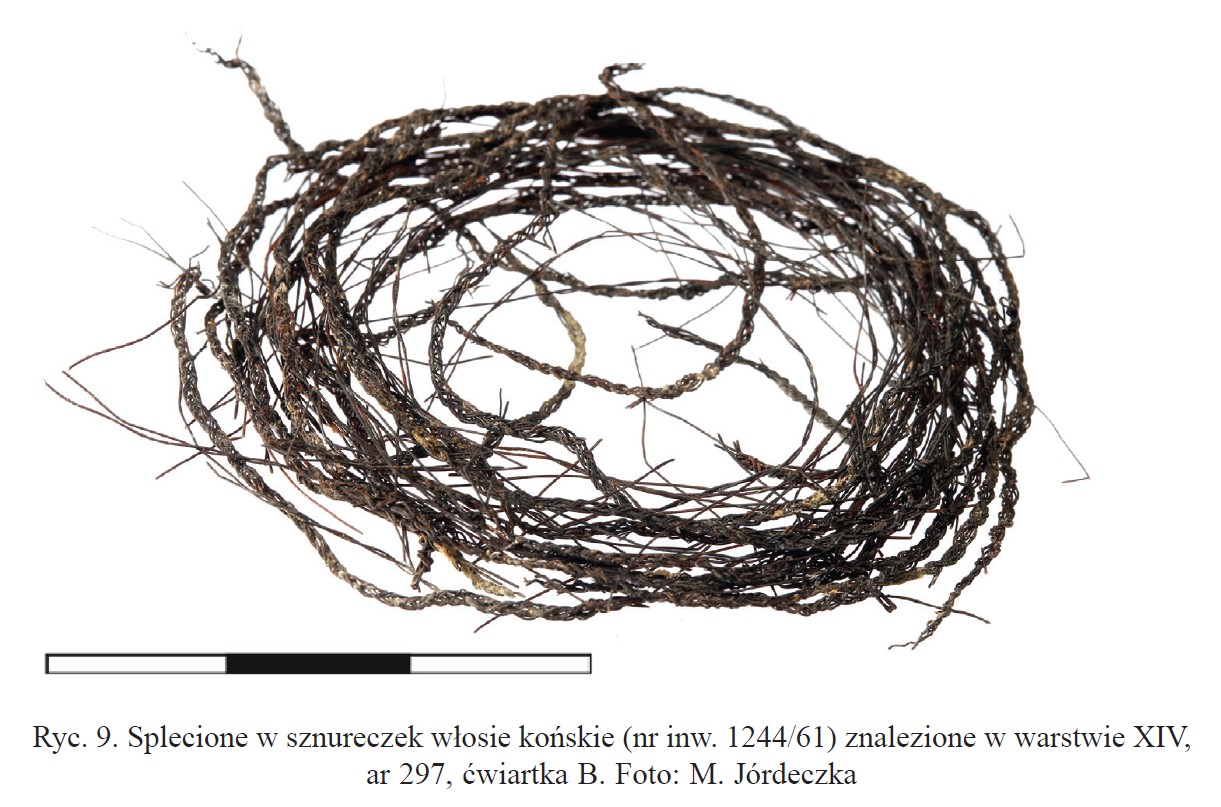 Paciorki, z których rekonstrukcjami miałem do tej pory do czynienia, posiadały otwory o średnicy pozwalającej bez większego problemu nanizać je na lnianą nitkę, a nawet na sznurek konopny, podobnie jak przy tych z Grodźca Małego. Zgoła czegoś zupełnie odmiennego wymagają paciorki o tak małych średnicach, jak te najmniejsze z obiszowskiego zestawu (2 – 2,5 mm). Czegoś zdecydowanie cieńszego, a zarazem na tyle mocnego, żeby nie łatwo było to zerwać. Wydaje się, że eksperyment z warkoczem uplecionym z trzech końskich włosów, w podobny sposób jak wykonano sznureczek z Santoka (Zamelska-Mończak et al. 2025 Ryc. 9), ma szansę podołania takiej potrzebie (patrz zdjęcie powyżej).