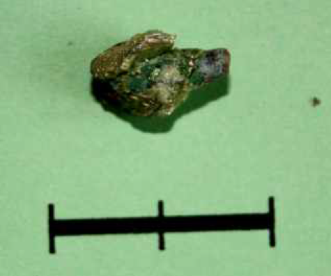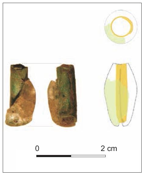 Zabytek o nr inw. Obi316/99 przypomina mi paciorek oliwkowaty odkryty w fosie grodziska w Połupinie wykonany z przeźroczystego białego o lekko zielonym zabarwieniu szkła sodowo-wapniowego odmiany Na-Ca-Al-Si (sodowo-wapniowo-glinowo-krzemowego) nawiniętego na metalową rurkę wykonaną ze stopu miedzi i ołowiu (Sawicka 2016 s. 109-112).