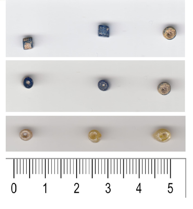 Dzięki niezwykłej uprzejmości Sylwii Siemianowskiej udało się dotrzeć do kilku niezwykle dla nas cennych materiałów w postaci jej pracy magisterskiej poświęconej obiszowskiej osadzie przygrodowej w świetle źródeł ceramicznych (Siemianowska 2011) oraz zdjęć archiwalnych. Do najważniejszych z perspektywy niniejszego artykuły z pewnością należą zdjęcia poszukiwanych paciorków oznaczonych nr inw. Obi160/86 i Obi161/86, czyli 3 żółtych i 3 walcowatych ze skorodowanego szkła. Na zdjęciach nie tylko zobaczymy, że żółte paciorki można nazwać co najwyżej zniekształconymi oraz że oprócz korozji na tych walcowatych wyraźnie widoczne jest niebieskie szkło.