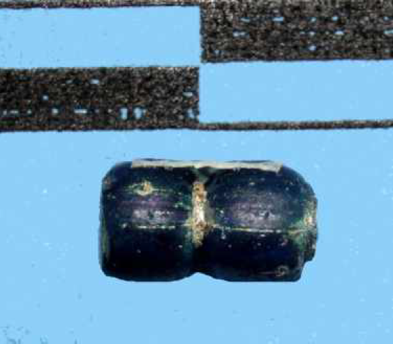 - paciorek segmentowy wykonany z ciemnoniebieskiej wyciąganej szklanej rurki o nr inw. Obi478/98 (Siemianowska 2011, Materiały, Obiekt 26A);