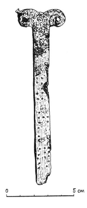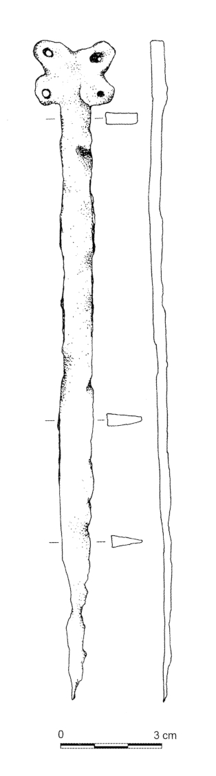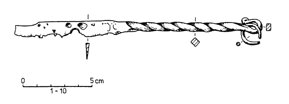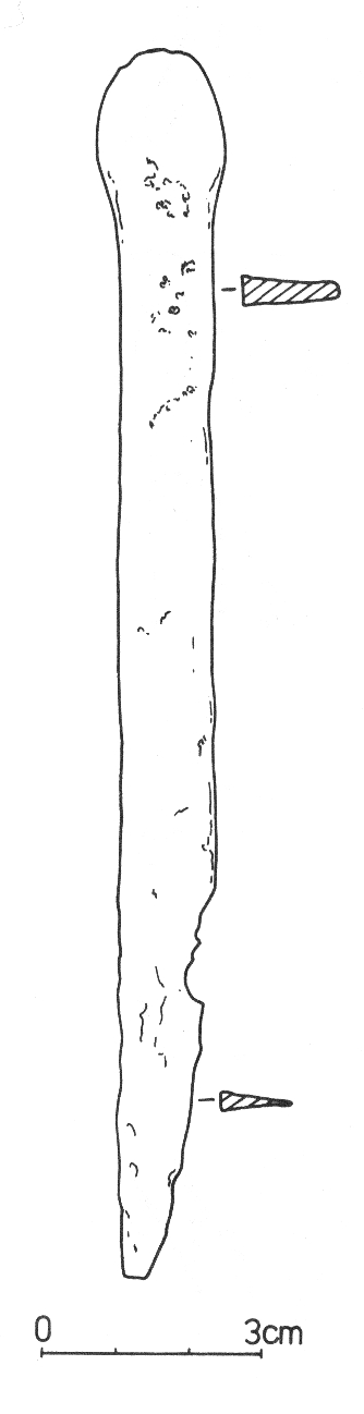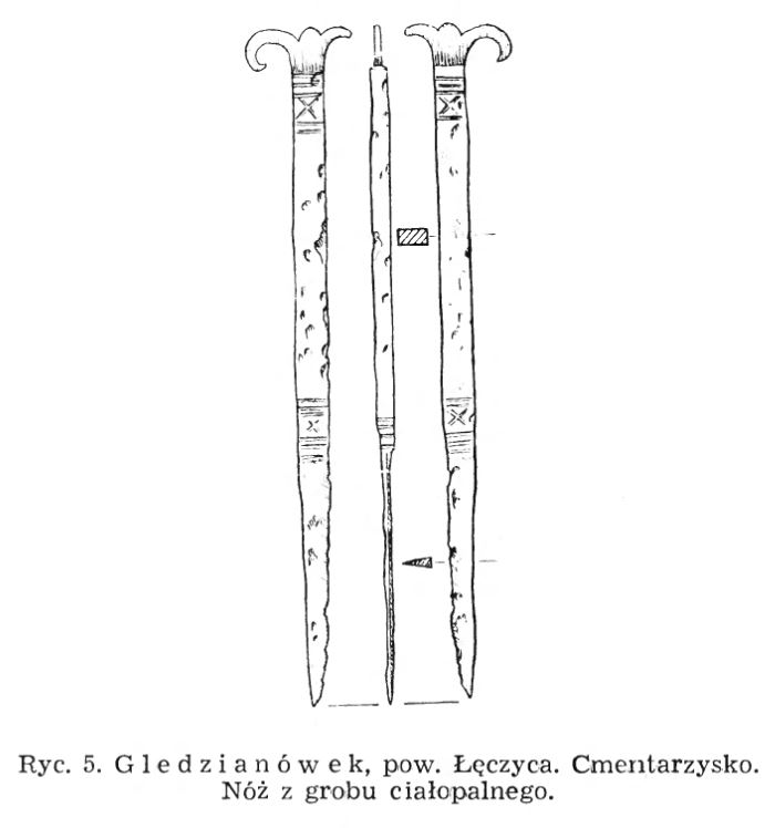 - wymiary zdjęte ze skali na rysunku: długość noża 17 cm; szerokość rękojeści 0,9 cm (Iwanicka-Pinkosz 2000 s. 94)