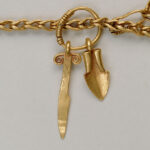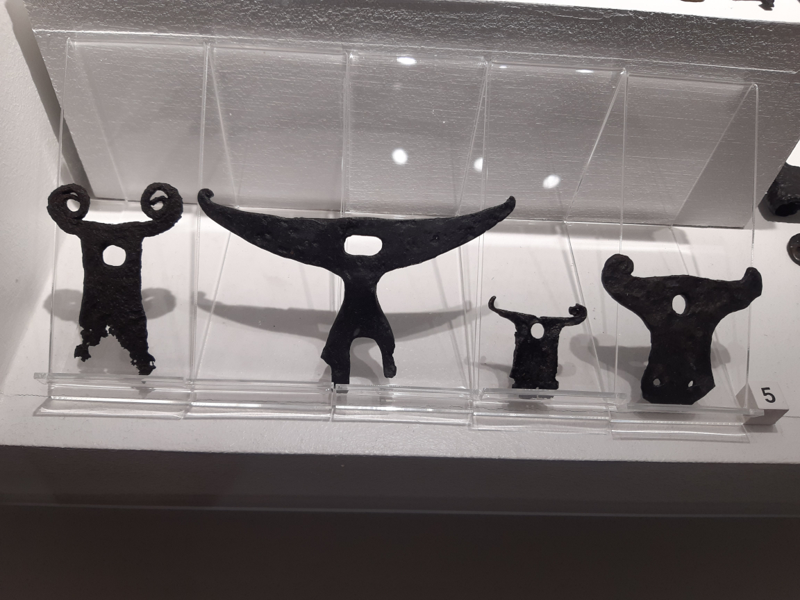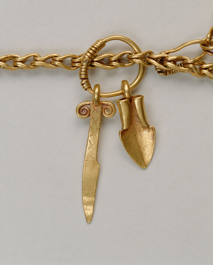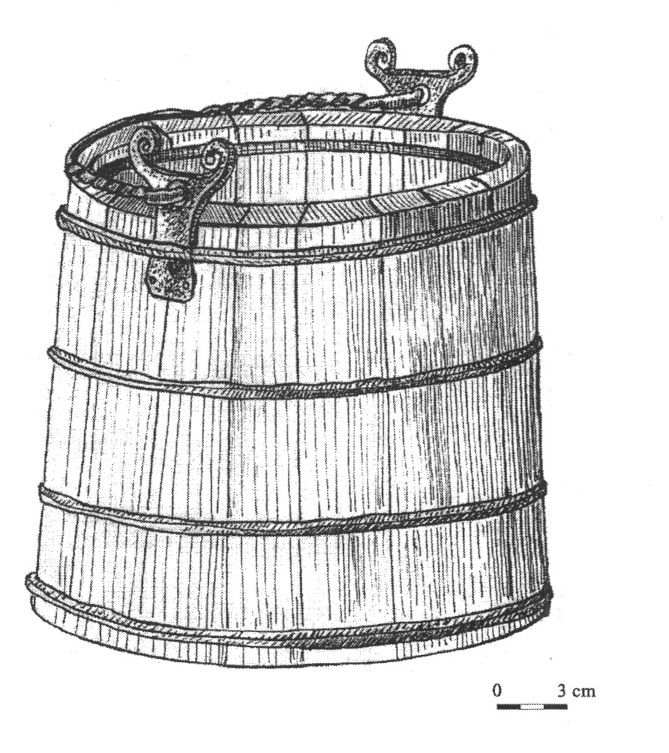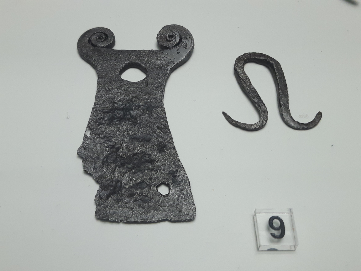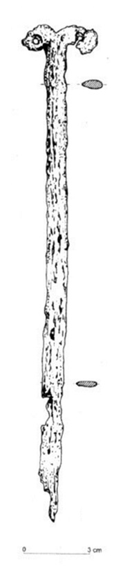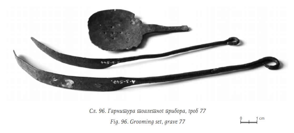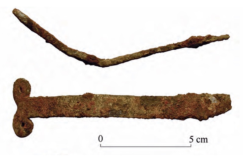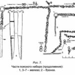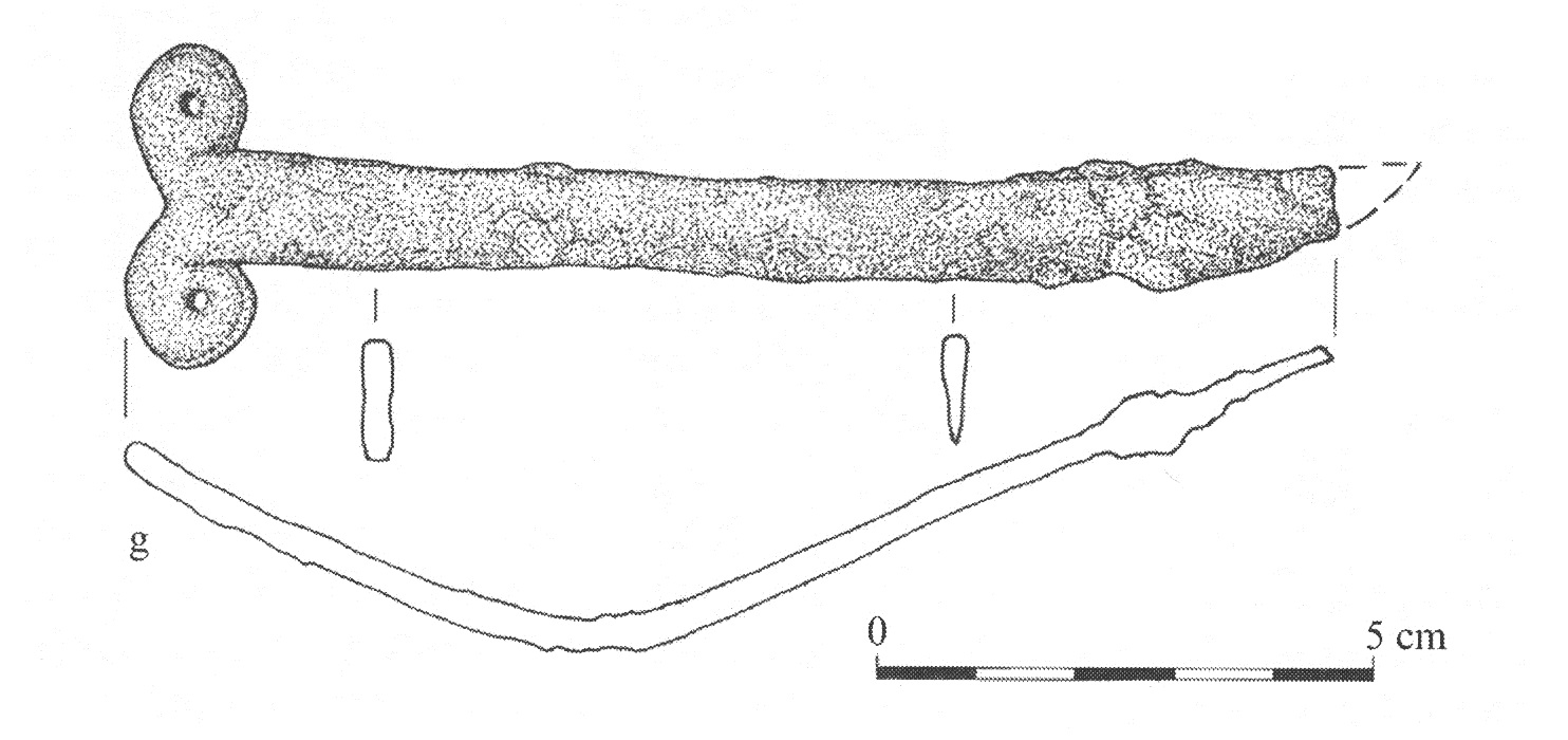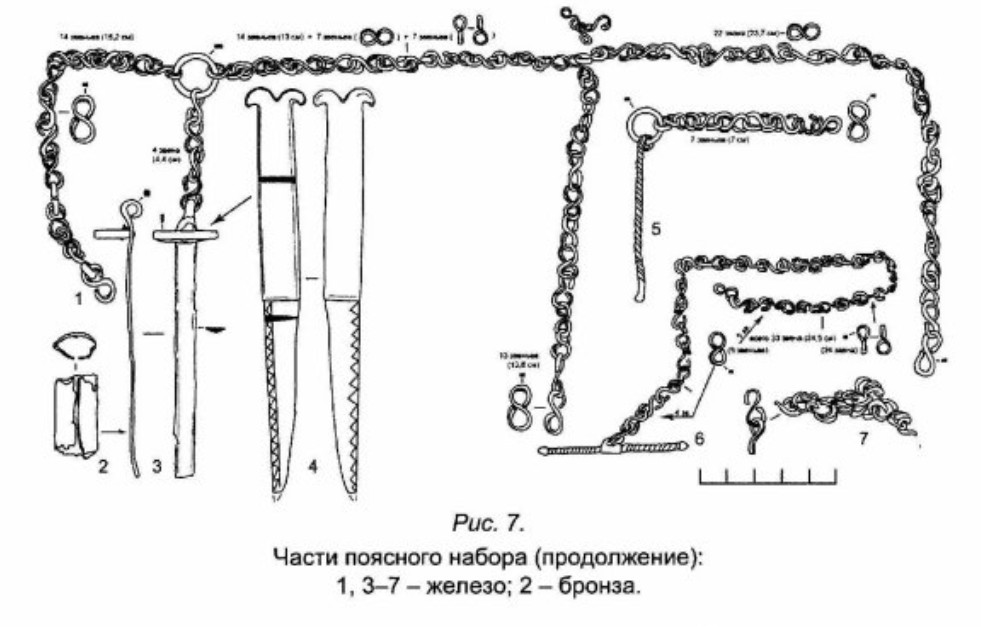 W wolutach niektórych z rzeczonych zabytków zdarzają się również wciąż tkwić żelazne kółeczka, będące być może ogniwami łańcuszków. Przy tej okazji przywoływany bywa nożyk ze Starej Pokrovki, który odkryto w towarzystwie całego pasa wykonanego z łańcuszka z podwieszanymi do niego elementami (Аксёнов et al. 2017 Рuс. 2, 7). Jak zauważył Pawlicki, to pochwa, a nie sam nóż przymocowana był do łańcuszka na stałe. Zresztą bezpośrednie przymocowanie noża byłoby niemożliwe, gdyż zakończenie noża nie było uformowane w zamknięte pierścienie. Poza tym omawiany zabytek nie jest wiązany z kulturą słowiańską (Pawlicki 2021 s. 83).