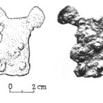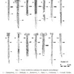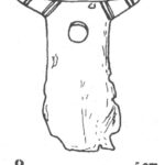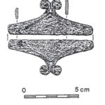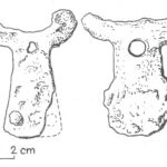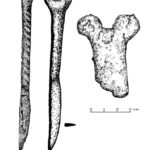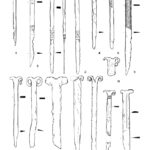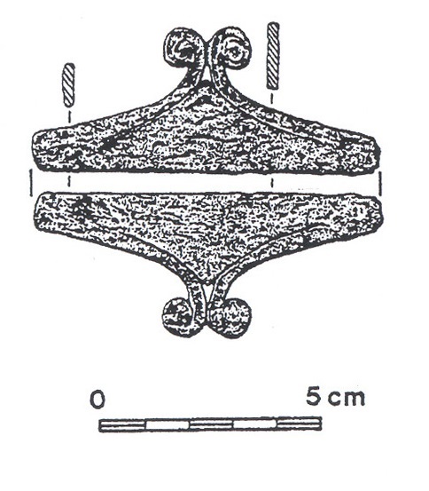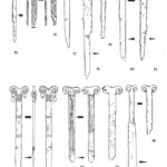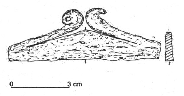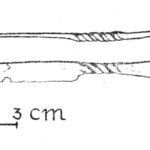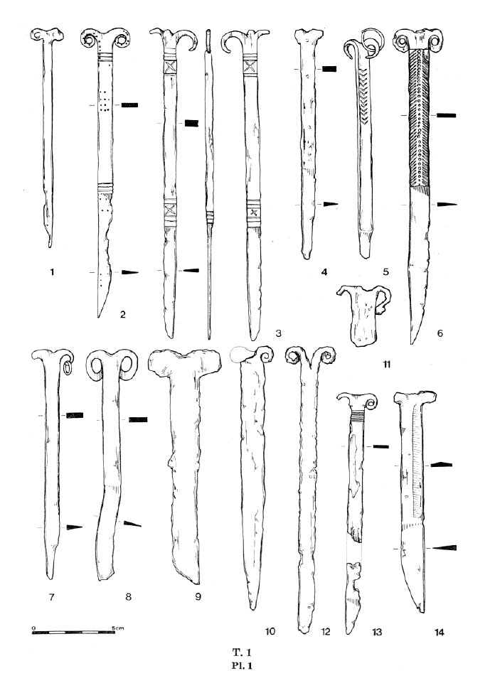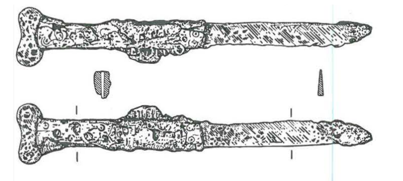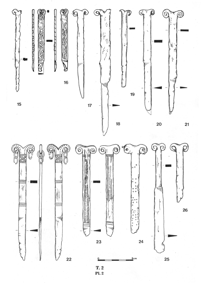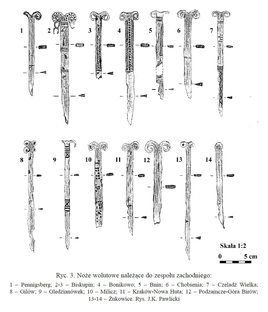 Należy nadmienić, że w tej dość jednorodnej grupie zabytków sporadycznie odnotowuje się odstępstwa od powyższej definicji. Badacze proponowali usystematyzowanie zabytków, uwzględniając te różnice w postaci różnych typów. Nie wchodząc w szczegóły typologii, wspomnę jedynie, że jak zauważył Pawlicki, to staranność wykonania mogła mieć wpływ na końcowy detal wolutowego zakończenia noża (Pawlicki 2021 s. 77). Z tego samego względu nie jestem przekonany co do potrzeby rozdzielania typów I i II według tego badacza, których podstawa leży w ilości zwojów w wolucie. Problem z przydzieleniem do konkretnego z tych dwóch typów pogłębia dodatkowo stan zachowania zabytków. Kolejną kwestią uzasadniającą potrzebę systematyzacji jest tendencja do rozszerzania tej grupy zabytków o takie, w których obecność samych wolutów może być dyskusyjna.