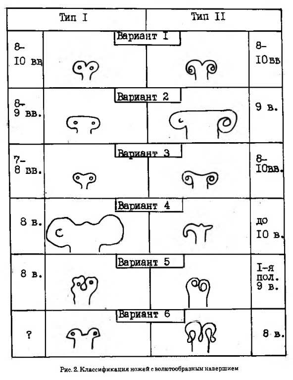 Korolʹkova Ljudmila Valentinovna ‘Voprosy interpretacii nožej s voljutoobraznym naveršiem’ [w:] ‘Tverskoj Arheologičeskij Sbornik’, t. 1, s. 234-238, Tverʹ 1994;