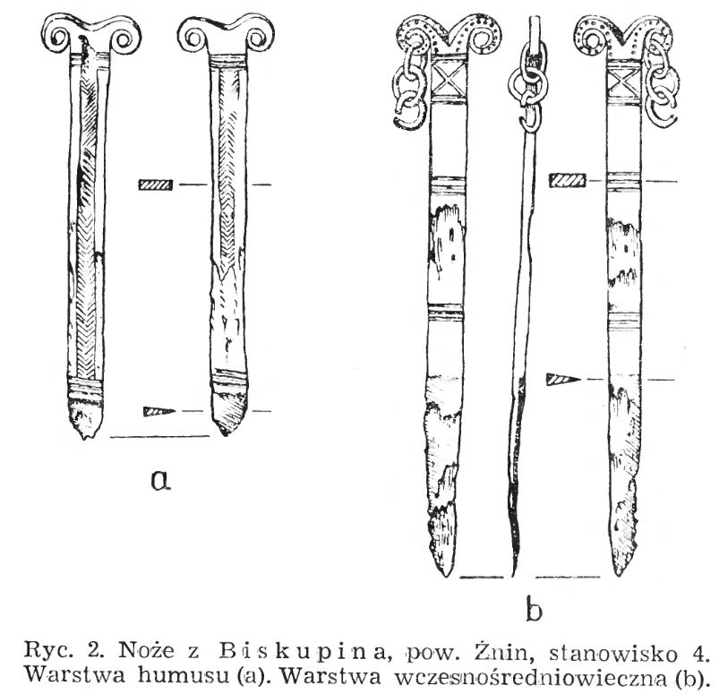 Rajewski Zbigniew Adam ‘Scytyjski nóż znaleziony w Biskupinie’ [w:] ‘Przegląd Archeologiczny’, t. 8, zeszyt 1, Poznań 1948;