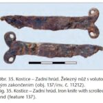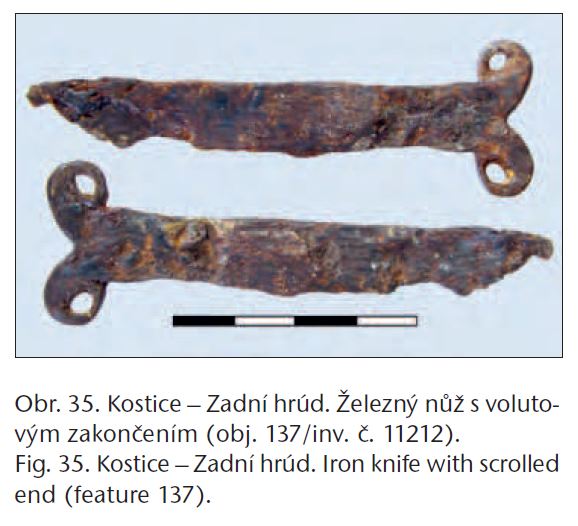Jakub Karol Pawlicki utrzymuje datowanie najmłodszych z noży na fazę powielkomorawską przypadającą na X w. (np. Kostice-“Zadní hrúd”), na podstawie cech ceramiki (Pawlicki 2021 s. 82-83 za Biermann et al. 2015 s. 111). Co ciekawe, autorzy przytaczanej przez Pawlickiego publikacji powtarzają w zasadzie tę samą informację, którą odnajdujemy we wcześniejszej pozycji jednego ze współautorów. Jiži Macháček stwierdza tam, że w świetle znaleziska z Kostice-“Zadní hrúd” pogląd o niewystępowaniu noży wolutowych w okresie X-XII w. należy zrewidować. Obiekt 137, w którym znaleziono zabytek wydatowany tam na XI w. na podstawie ceramiki i stratygraficznie, został naruszony przez obiekt z XII w. Sam nóż wolutowy w tabelarycznym zestawieniu zabytków opisany został tam jako pochodzący z fazy RS4, czyli X-XII w. (Macháček et al. 2013 s. 763-767). Zapytany o tę kwestię, Pawlicki raczej utrzymuje datowanie noża na wiek X na podstawie ceramiki, której wiek konsultował z Aleksandrą Pankiewicz. Jego wątpliwości budzi również jedność zbioru zabytków pochodzących z obiektu, choć nie wyklucza przetrwania zabytku w młodszym zbiorze jako “pamiątka rodzinna” (informacja ustna od Jakuba Karola Pawlickiego).