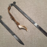 Rekonstrukcji moich egzemplarzy noży z Chobieni i Żukowic dokonał Ludosza. Żukowicki nożyk doczekał się opakowania inspirowanego pozostałościami drewnianej pochewki na zabytku z Kiszomobor oraz ogniwka w jednym z wolutów, przez które przewleczony został rzemień ułatwiający wyciąganie noża z pochwy (tu zakończony fragmentem fajki dzika).