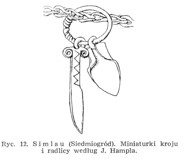 Pośród kilkudziesięciu symbolicznych miniaturek narzędzi wchodzących w skład naszyjnika pochodzącego z Szilágysomlyó (dziś Şimleu Silvaniei w Rumunii) okresu wpływów rzymskich, znalazło się takie, które na podstawie wystąpienia w towarzystwie radlicy, identyfikuje się z krojem płużnym. Kształt tego narzędzia, jak również zdobienie jego rękojeści, przywodzi skojarzenia z nożami wolutowymi (Pawlicki 2021 s. 93).
